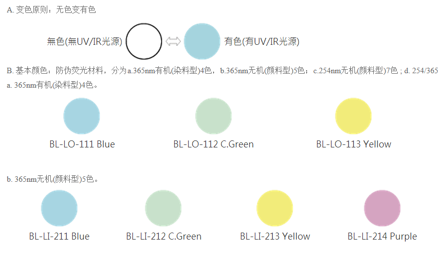 本系列產(chǎn)品特殊熒光體在可見(jiàn)光光源下,呈現(xiàn)白色或接近透明色,在不同波長(zhǎng)光源下(254nm、 365 nm、 850 nm) 顯現(xiàn)一種或多種熒光色澤,包括有機(jī)、 無(wú)機(jī)、余暉等特殊效果,色彩鮮艷亮麗,熒光標(biāo)識(shí)材料主要用于生產(chǎn)防偽油墨和標(biāo)志塑料。